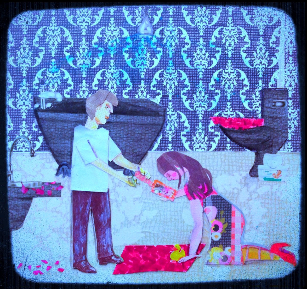 The bathroom is luminous: blue projection lamps glow cool as pool lighting, dried orchid petals litter the black sink and vanity. You’ve never seen a black bathtub, especially one where rubber ducks and squeeze toys frolic in its depths. The toilet lid and tissue dispenser adorn themselves in burgundy fur. He takes out a hand mirror, a bouquet of golden flowers enameled on its back, scrapes methadrine with a razor blade; it’s damp and crumbles like gum eraser no matter how fine he chops it. Dividing it while you moisten your lips and bat your eyes not at him but at it, he tells you to kneel. Bible verses begin to float through your mind. You notice the sponge duck’s webby feet. The toilet seat and Kleenex dispenser begin to sweat under their furs of red. Likewise, when they had killed the rams, they sprinkled the blood up the altar. Kneeling before the mirror and black sink, under the racked lighting, kneeling for the prize that makes your heart race, how glitter-sharp its edges. In purgatory you’ll kneel forever in the forbidden thick red carpet, in the scarlet blood of too-salty beets. On the mirror the taste of cat urine and yellow apples. The roots in your teeth quiver. In the parallel universe of goodness you’re not bowing your head over the mirror, pressing the last taste of yellow into your gums, sucking the bitterness from your thumb. Over the razor blade’s edge your grandmother’s in the farmhouse kitchen making strudel, draping  rolled-out dough long as cheesecloth over the table, chopping the orchard apples with raisins and walnuts and cinnamon. When your grandmother looks up, you hide yourself.