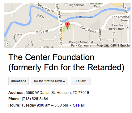 The Center for the Retarded on West Dallas. Google it and you’ll discover it recently changed its politically incorrect name.