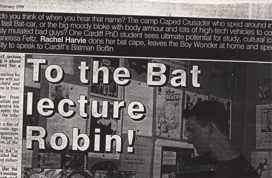 I stopped the training, the night-time patrols, but not because I’d done anything wrong. I stopped because I’d become too well-known. First in Cardiff, after I gave a lecture on the Dark Knight from 1939-99 – Y Marchog Tywyll was the headline (in Welsh) in Gair Rhydd, the student newspaper – and then beyond, as the media picked up on the story that someone was doing a doctorate in Batman.