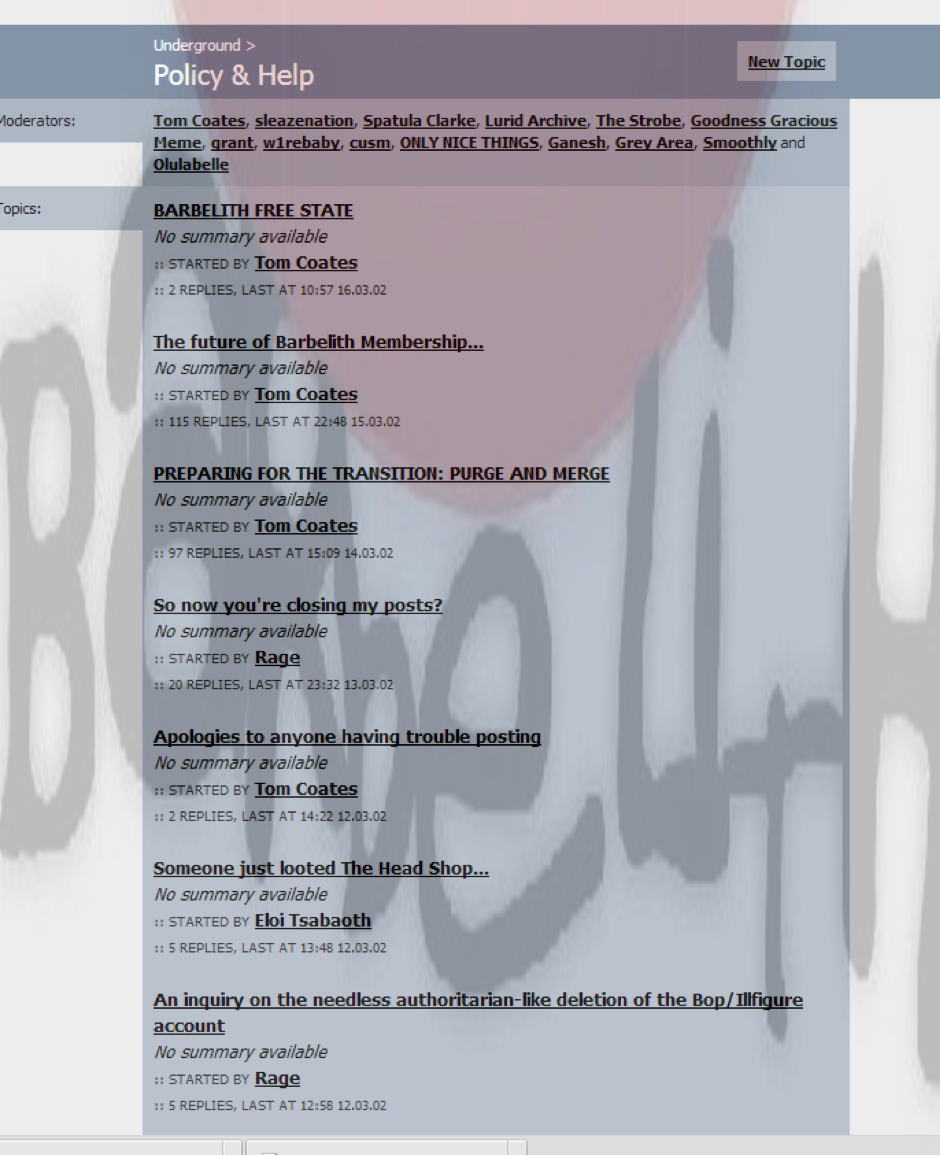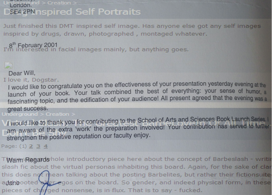 Like me, most people on Barbelith were living a double life, a secret identity, a phantom existence behind the official day-to-day. Separate pages in a diary. But sometimes pages bleed through.