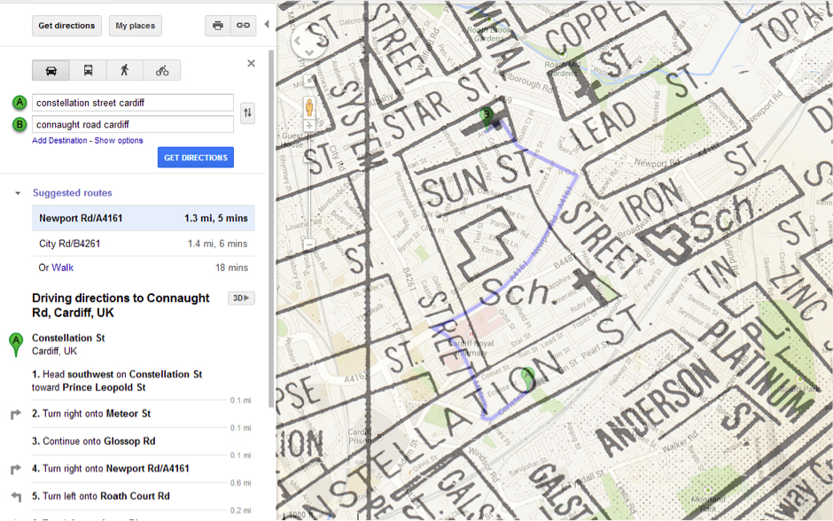 I used to live in Cardiff. On Connaught Road. Can you see it, on the map? Strung onto that constellation of resonant names: sapphire, topaz, silver, planet, emerald, star. Like a science fiction universe: a map of manyworlds, of infinite earths. A roll-call of superheroes.