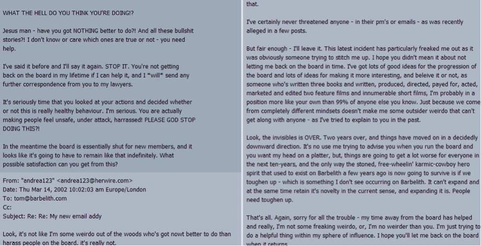 I went through all my posts that morning, erasing and revising any giveaway clues – I’d even written about a specific class, on John Ford, that Andrew had taken part in. Barbelith was a large discussion board, and I hoped he hadn’t read every detail. I emailed the moderators, the manager and the veterans, telling them I knew who this Andrew was; I knew his email, I knew what he looked like, I knew, roughly, where he lived. They invited me to their private discussion room and took my evidence very seriously. It was exciting, like being a boy witness surrounded by grave but kindly policemen. They thanked me for letting them know, and said they would act on it.