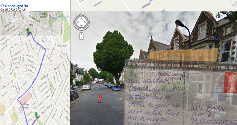 The picture above doesn’t actually show my road, Cathays Terrace. I had to manoeuvre Google Street View around the corner and swivel its virtual camera back, to find my own origin point. That window in a white wall. That’s where I stayed.