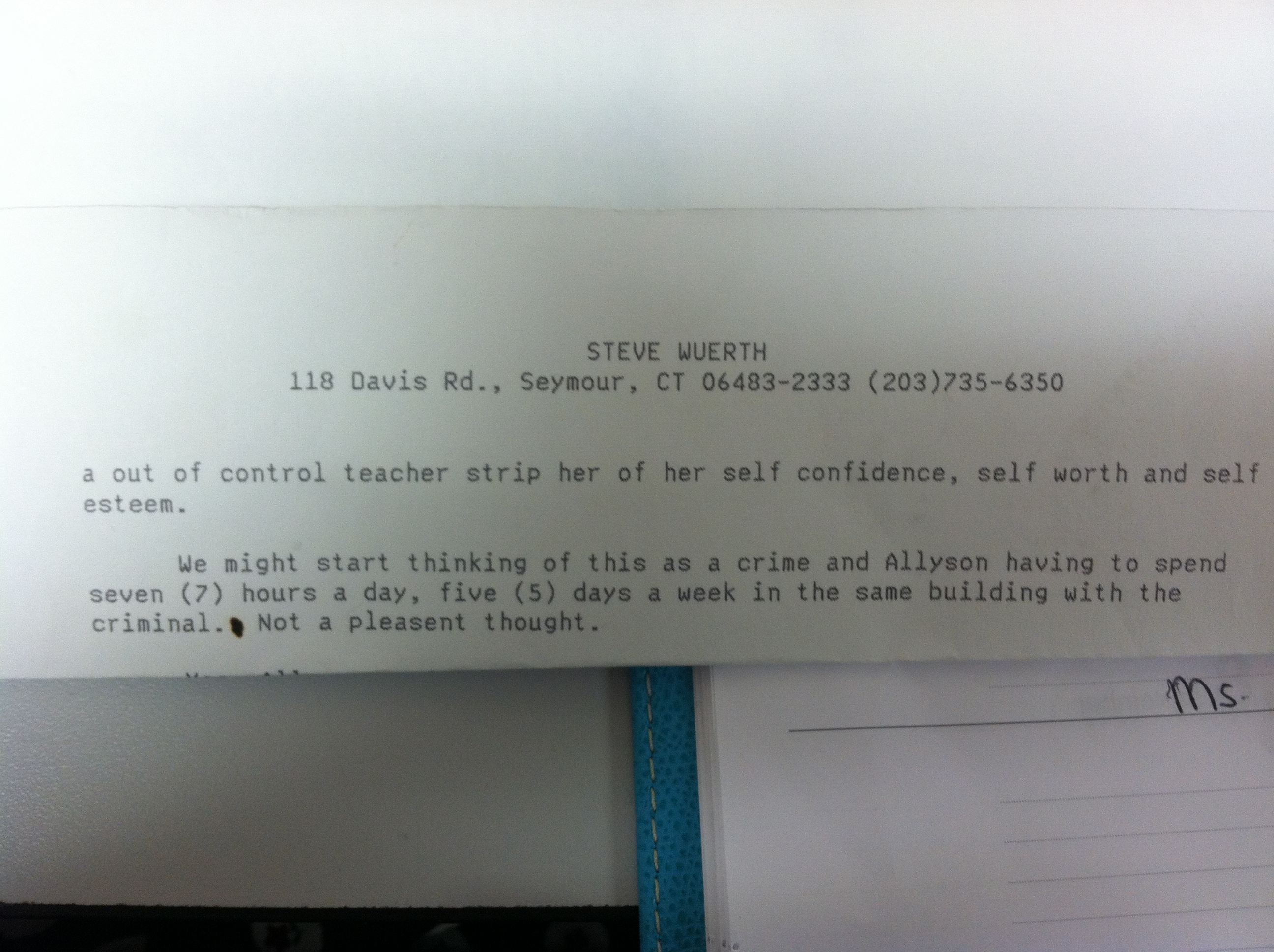 My father wrote, “I wish to say that I failed to see this developing situation and in doing so I let my daughter down when she really needed my support. I think it is realistic to suggest that you as administrators have not visualized this from Allyson’s perspective. Remember, that is the perspective of a girl during a time in her life when she should be having fun, making friends, and finding herself. Not having an out of control teacher strip her of her self- confidence, self-worth, and esteem.” In his revision, he changed the word “visualized” to “grasped.” I love that he revised his letter again and again. Each draft saved for so many years. In his final copy, he added into his conclusion: “Even with this traumatic experience Allyson is still doing better than most X High School students.”
