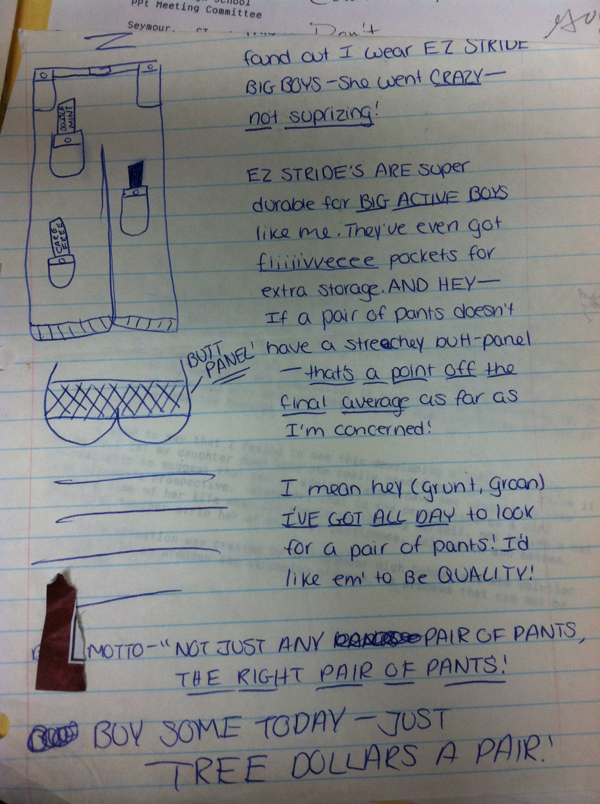 We sat dead silent, a mixture of the riff-raff of the school, smarter freshmen, and jocks who were sent to Coach Billy K. for the sake of the Bobcats. Sometimes he’d stand up, adjust the elastic waist on his cargo pants and spend fifteen minutes checking to see that we all had book covers on our school-issued math books. Casey claimed his pants were called “EZ Stride Big Boys,” and every time he ran his stubby thumbs under the elastic I had to force down a laugh. He’d move through the room, only pausing to clear his throat and ask, “’Comin’ to practice today, Todd?” or “How’s dat arm, Brand?” or “No book cover, Brian? Not surprising. Dat’ll be a point of yer final average.”