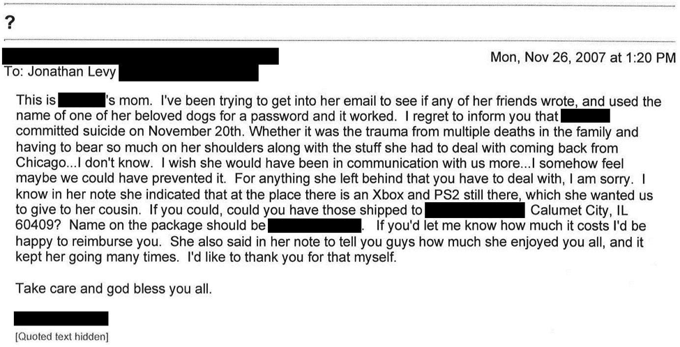 “My name is Jon. I was one of Shayna’s roommates in Chicago. I don’t know what to say. I’m so sorry. I was going to mail you her Xbox and PlayStation 2, but we figured, you live so close, we could drive everything of hers to you, including books and clothes and everything else, and then you wouldn’t have to worry about shipping.”