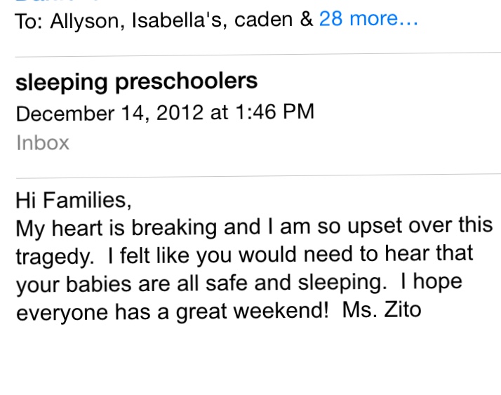 My daughter’s classroom was right across the hall from my son’s. This, before December 14, 2012, was always a comfort to me. My son, 6, with his watchful eyes always peering into his little sister’s preschool classroom, my daughter, only then beginning to emerge from her shyness, coming home with stories about Tristan waving to her from the hall.