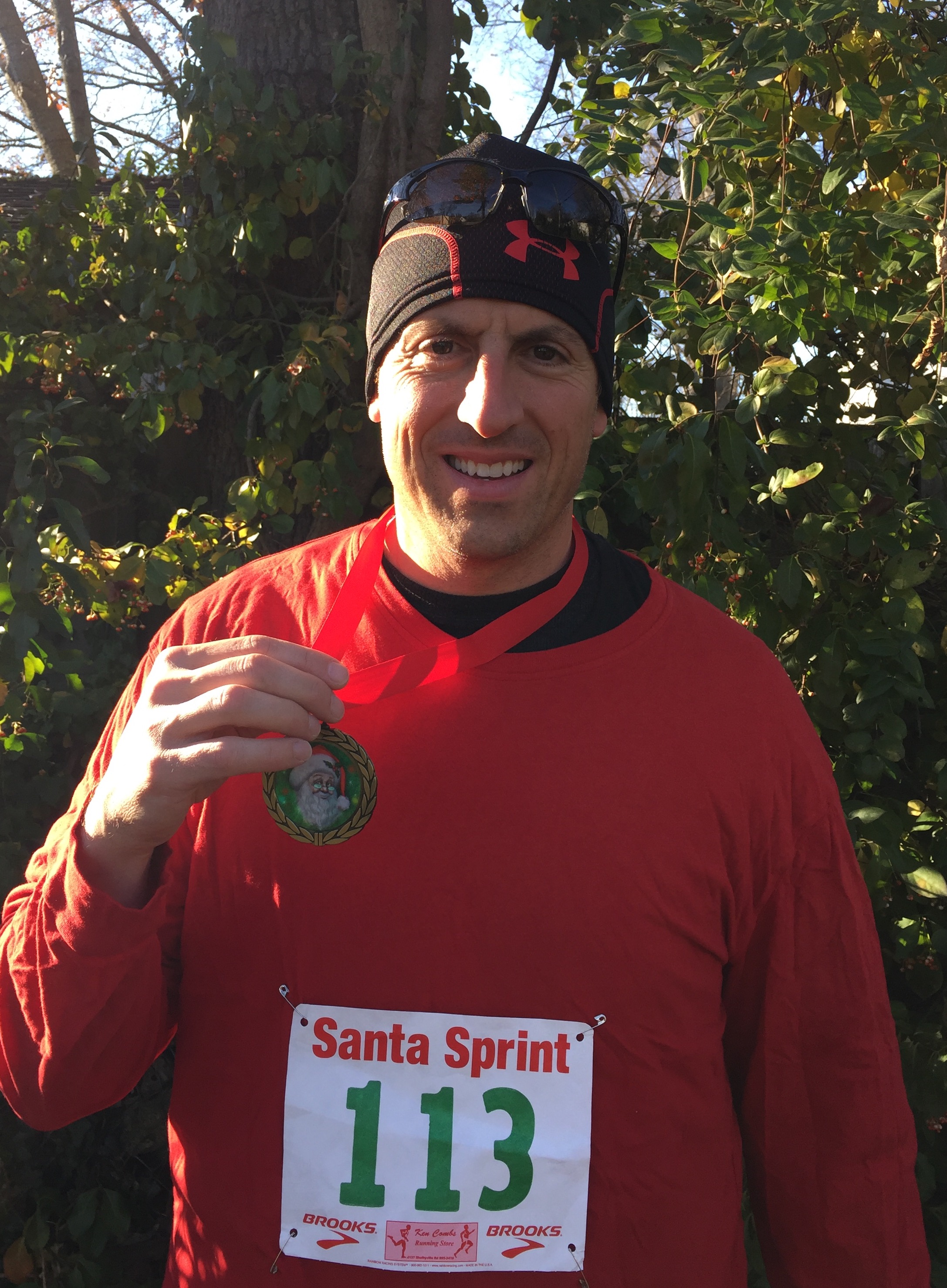 At the awards ceremony, the girl came in first in the girls’ thirteen-and-under division, while I placed third in the men’s 40-49 age group. It was a win for both of us. It was a win for old men everywhere. And the tin Santa Clause medal I received for my efforts would forever be a fixture on my Christmas tree.